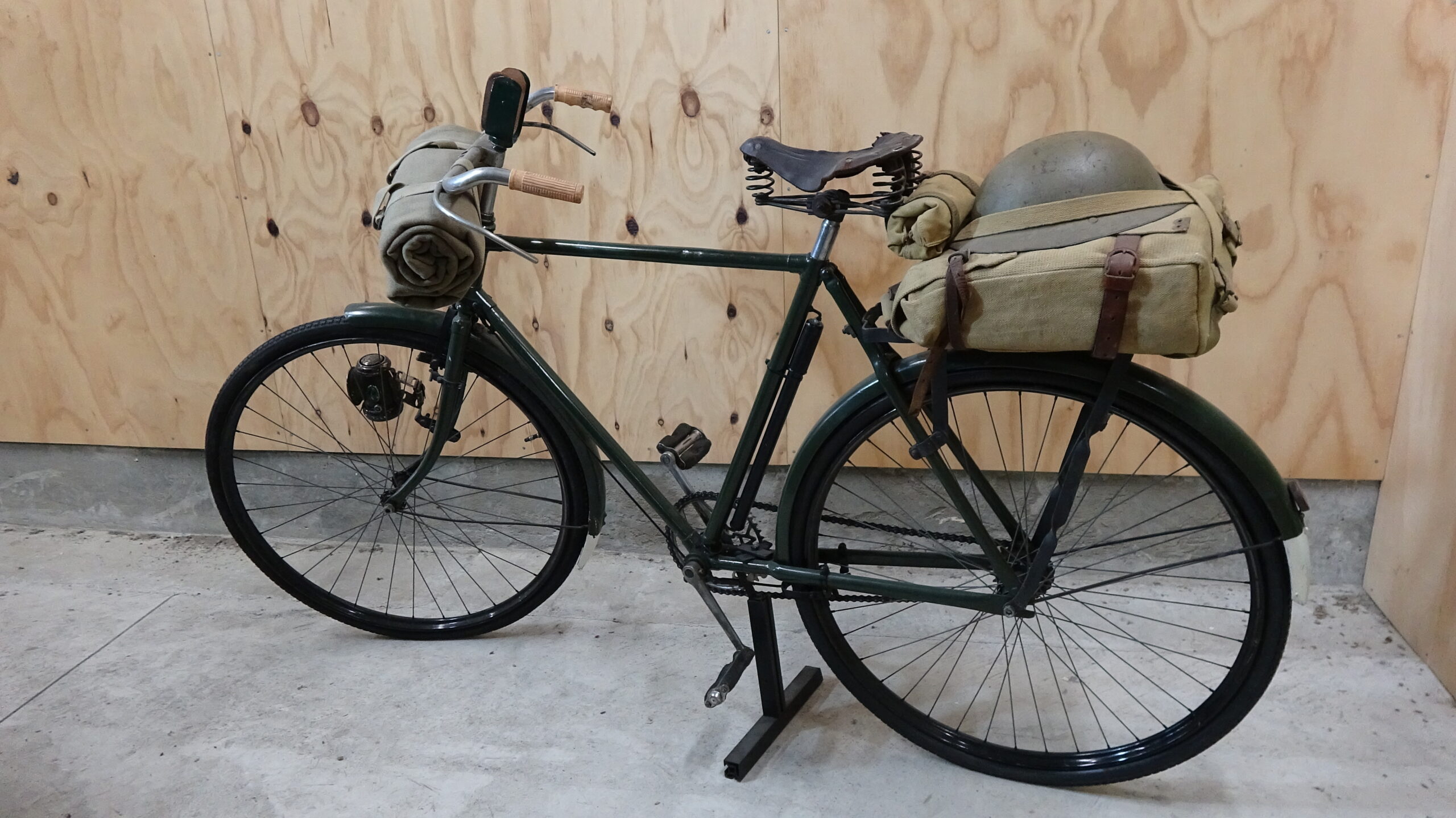 Our BSA Service Bicycle has the the NZD Broad Arrow and serial number stamped on the frame. It’s kitted out for a member of the NZ Cyclist Corps with a blanket roll attached to the handlebars, a canvas tool roll attached to the seat springs, and the 1908 large pack and helmet on the carrier. A kerosene lamp is fitted to the right front fork, and two steel brackets on the frame allow for carrying a rifle.