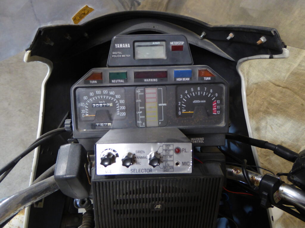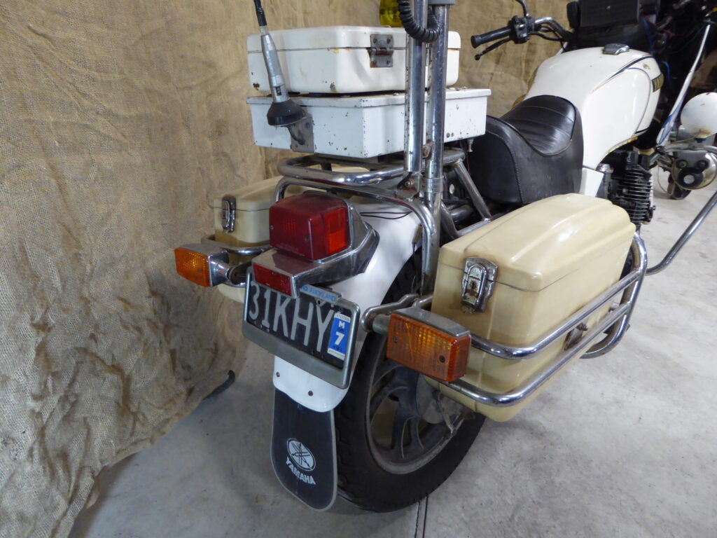 The XJ750 was a 750cc road bike built by the Japanese manufacturer Yamaha between 1982 and 1985. While being essentially the same as the standard civilian bike, the -P (Police Special) model did have a number of unique features, including the hard bags on either side of the rear wheel, the front fairing, a special Police digital speedometer (advanced technology for the day!), and the single rider seat.