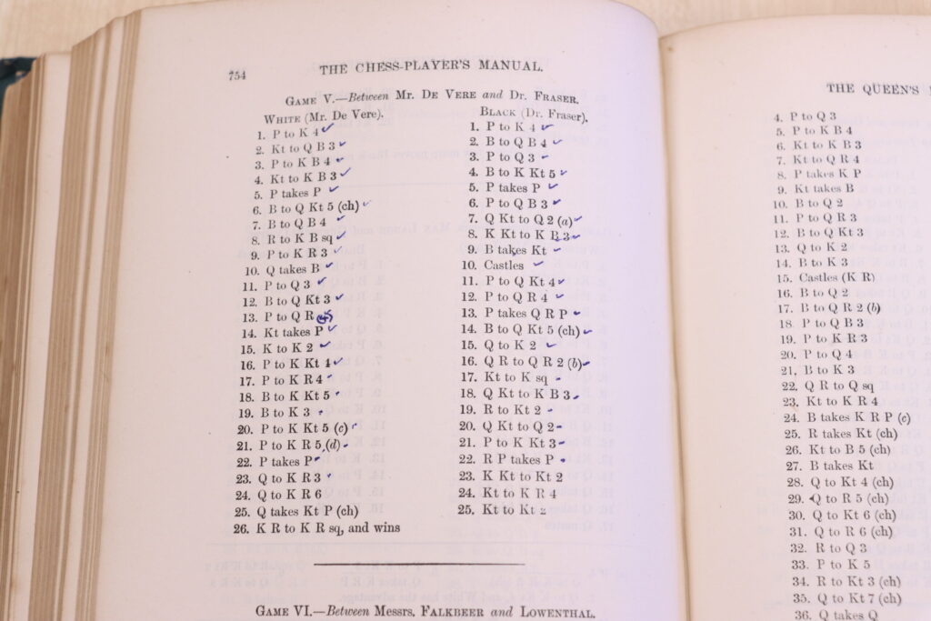 In the Kippenberger Research Library we have a locked display cabinet full of books. As unassuming as it looks (in a library full of books), it is in fact a very special part of our Museum collection. It holds books from Major General Sir Howard Kippenberger’s personal library. Mainly military books (with his own personal notes and annotations included), there are a few other titles, like this Chess Player’s Manual. Chess is well known as a game that develops critical thinking, problem-solving, and decision-making skills. It requires the player to think strategically, planning and anticipating multiple moves ahead, and adapting their strategies as their opponent responds. No doubt, Sir Kippenberger’s knowledge of chess helped with battle strategy, although the stakes were much, much higher in real life.