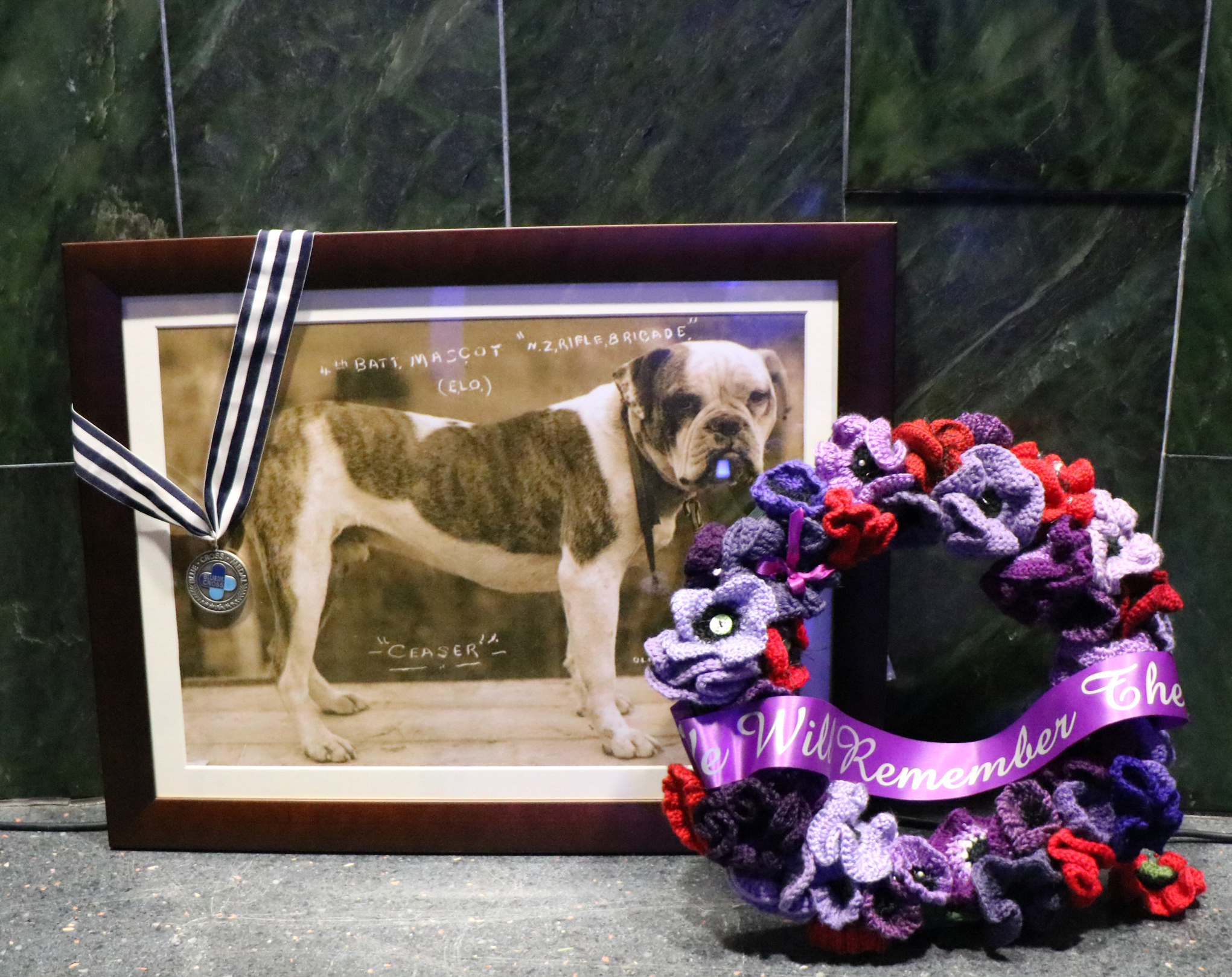 Ceaser’s collar has been donated to the Auckland Museum and bears a name plate with the inscription “Ceaser, 4th Battalion, NZ Rifle Brigade”. It is thought that his handler Thomas Tooman misspelt his name ‘Ceaser’ as at the time did not know of the traditional spelling of the name ‘Caesar’.