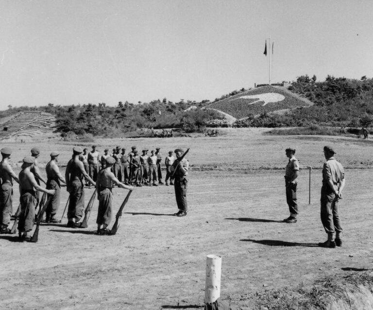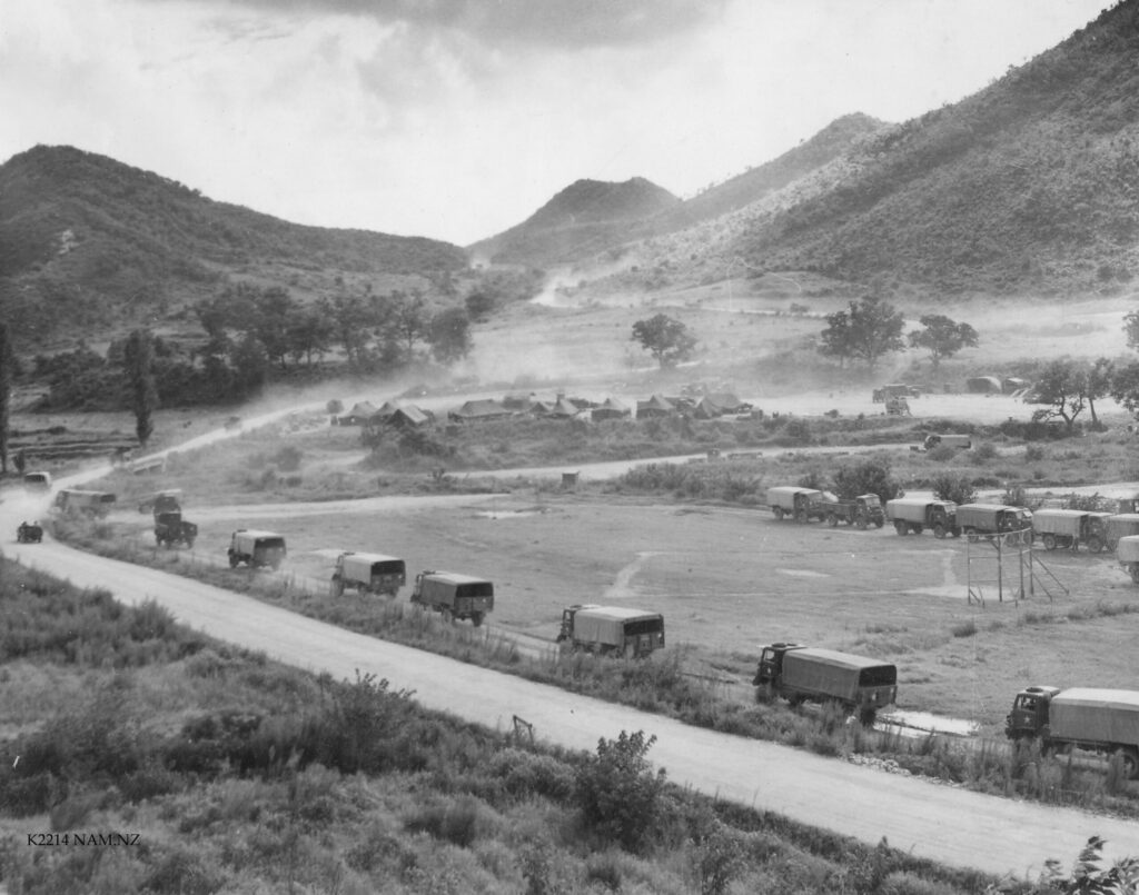 North Korea’s invasion of South Korea on 25 June 1950 led to a decision by the UN Security Council to drive the North Korean People’s Army back over the 38th Parallel by force if they did not withdraw voluntarily. North Korea did not withdraw. New Zealand responded quickly to the United Nation’s appeal to support South Korea, first sending two Navy frigates and then an artillery unit as the basis for a 1100 strong contribution known as ‘Kayforce’ (K Force) to serve as part of a multinational force. As well as the artillery regiment (16 Field Regiment), a transport company, a light aid detachment, and a signals troop were sent. Kayforce departed New Zealand on 10 December and reached Pusan, in southern Korea, on 31 December 1950. The contingent was attached to the 27th British Commonwealth Brigade which included two British and one Australian battalion.